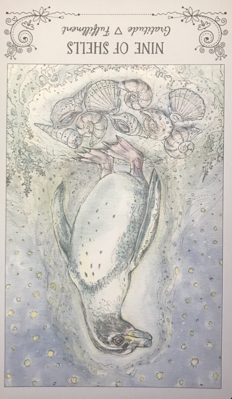 There’s also a beautiful symbolism in the penguin– who flies in the water as opposed to the air. The water, that is so consistently calling me to connect with it, invites me in with the penguin, but acknowledges my fear with the reversed draw. The penguin also is a symbol of balance, being a creature who lives in both Arctic as well as hot climates. That duality is also expressed in the diametric opposition of black and white on its body. It symbolizes the ability to handle and hold space for duality to exist, holding the balance and equilibrium between giving and receiving which is such a present part of my journey. Both penguin and reversed nine of shells also give the message to connect to family– which is beyond appropriate at this juncture for me.