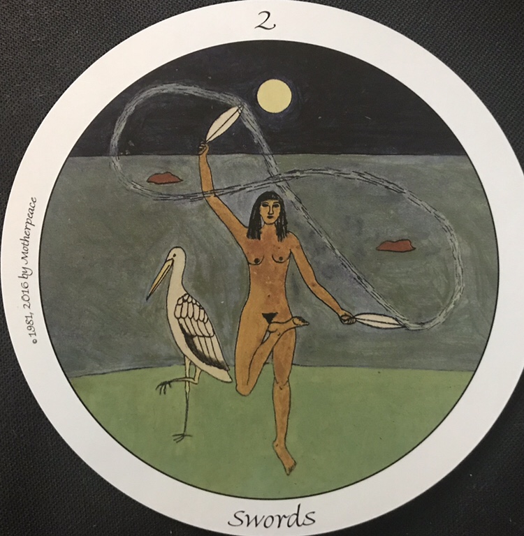 “Wow” is what I uttered as I drew this card from the deck this morning. The stark beauty of this image is striking. As I sit with this card in meditation, I immediately feel my spine elongating– a flow of energy moving out from my crown chakra. Then my attention, like yesterday, comes to my third chakra, which feels as if it’s rhythmically dancing. Sitting with the image there is a feeling of unity– of drawing together things that seem separate– but are not. The illumination of the full moon, shining on the naked figure is a revelation of openness. There is a peace– while acknowledging struggle, a resolve to being in what could be defined as a state of limbo.